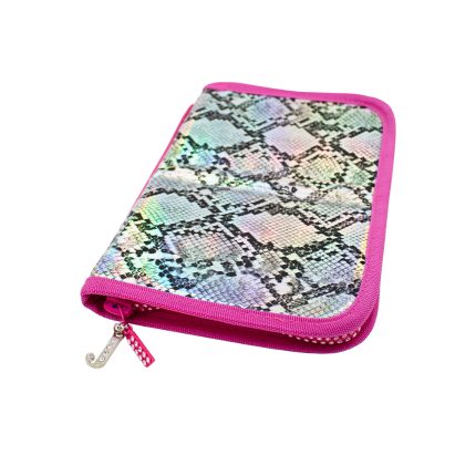 Manta porta-pinceles con print de serpiente holográfico y cremallera de pedrería. Cómoda y práctica para llevar tus utillajes, fresas y pinceles a todas partes y mantenerlos siempre a mano, protegidos y organizados. *Pinceles y herramientas no incluidos.