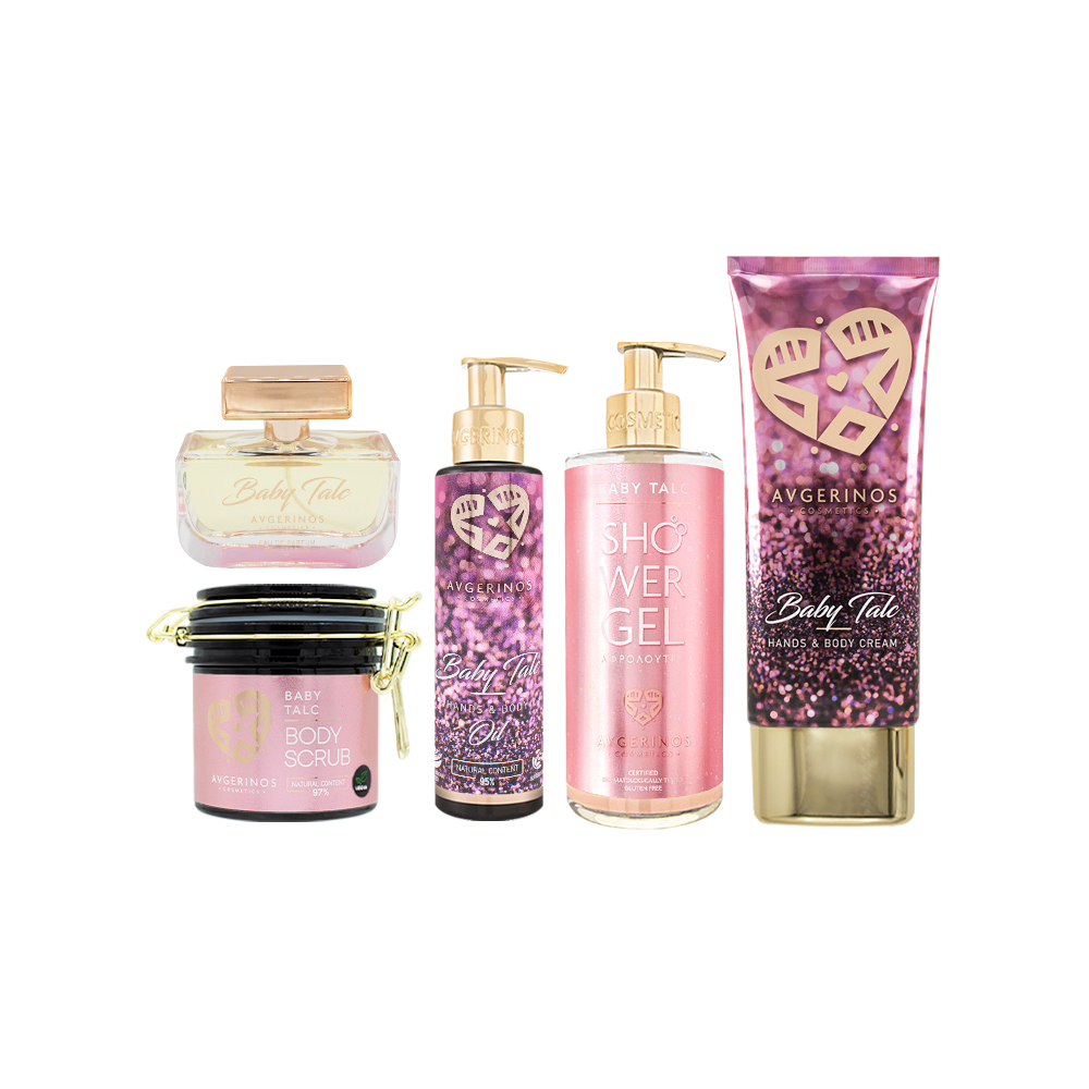 Disfruta de la gama Baby Talc al completo con un precio más económico: crema + aceite + body scrub + shower gel + perfume. Cosmética natural, vegana y sin parabenos.