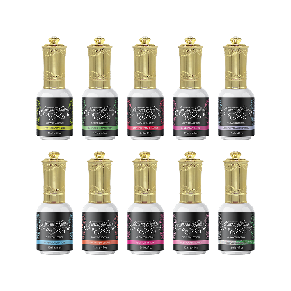 Colección de 10 colores glow que brillan en la oscuridad. Cada esmalte se activa por UV, LED o luz solar y brillará cuando se apaguen las luces.