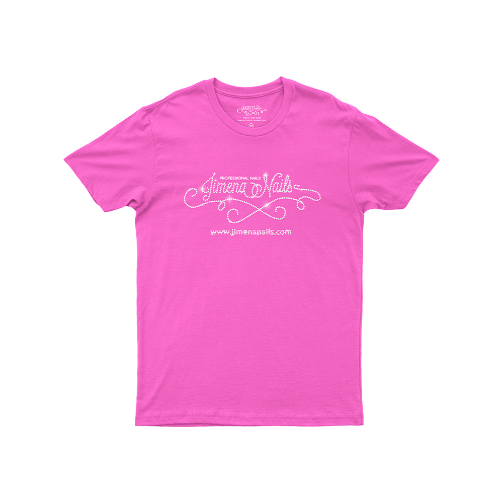 Camiseta color fucsia de algodón, con el logo de Jimena Nails bordado en pedrería AB.