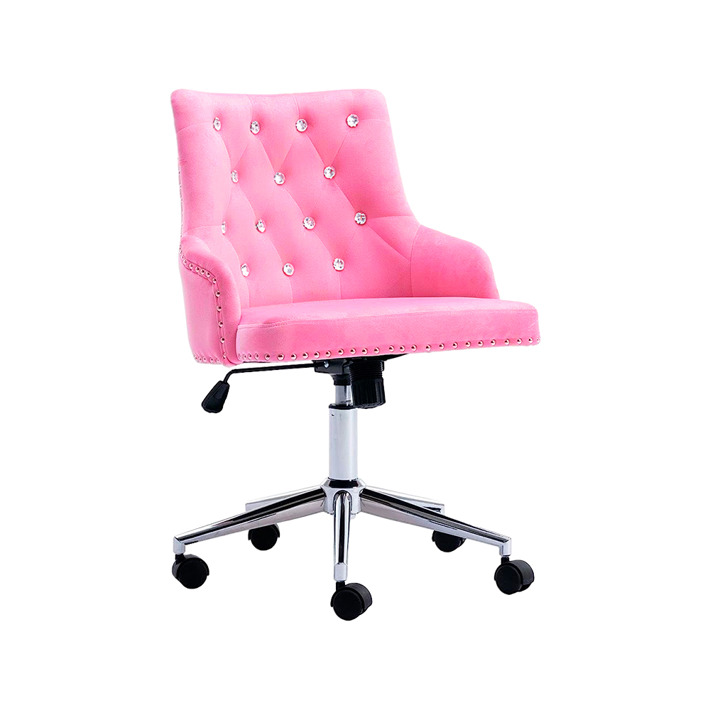Silla ergonómica ajustable en capitoné de color rosa. Perfecta para el uso diario en el puesto de trabajo, ya que se ajusta y regula a tu peso y altura. Permite una fácil y cómoda movilidad gracias a sus ruedas rotatorias 360º.